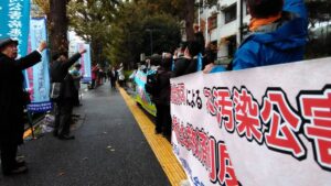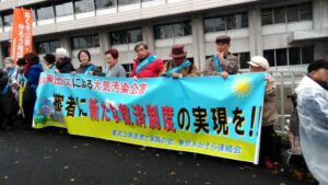 国と自動車メーカーが協力して”ぜん息等の患者医療費(自己負担分)を助成する制度を作ってください。”という調停を申し立てた私たちは、11月27日のお昼から環境省と調整員会前で患者さんや弁護士、支援の皆さんが訴えました。