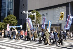 トヨタは内部留保を社会的に還元しろ~ とラップ調で沿道に訴えながらパレード(行進とは言いませんよ)しました。